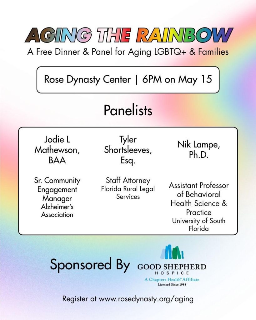 Join us at the Rose Dynasty Center on May 15 for a night with free food, resources, a panel discussion and more for our LGBTQ+ seniors. Register online at rosedynastyfoundationinc.org/aging.