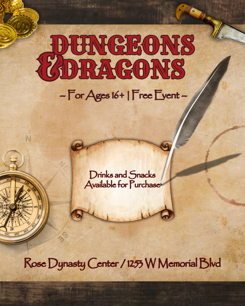 Ready to roll the dice and embark on an epic adventure? Join us for a Dungeons & Dragons event at the Rose Dynasty Center!