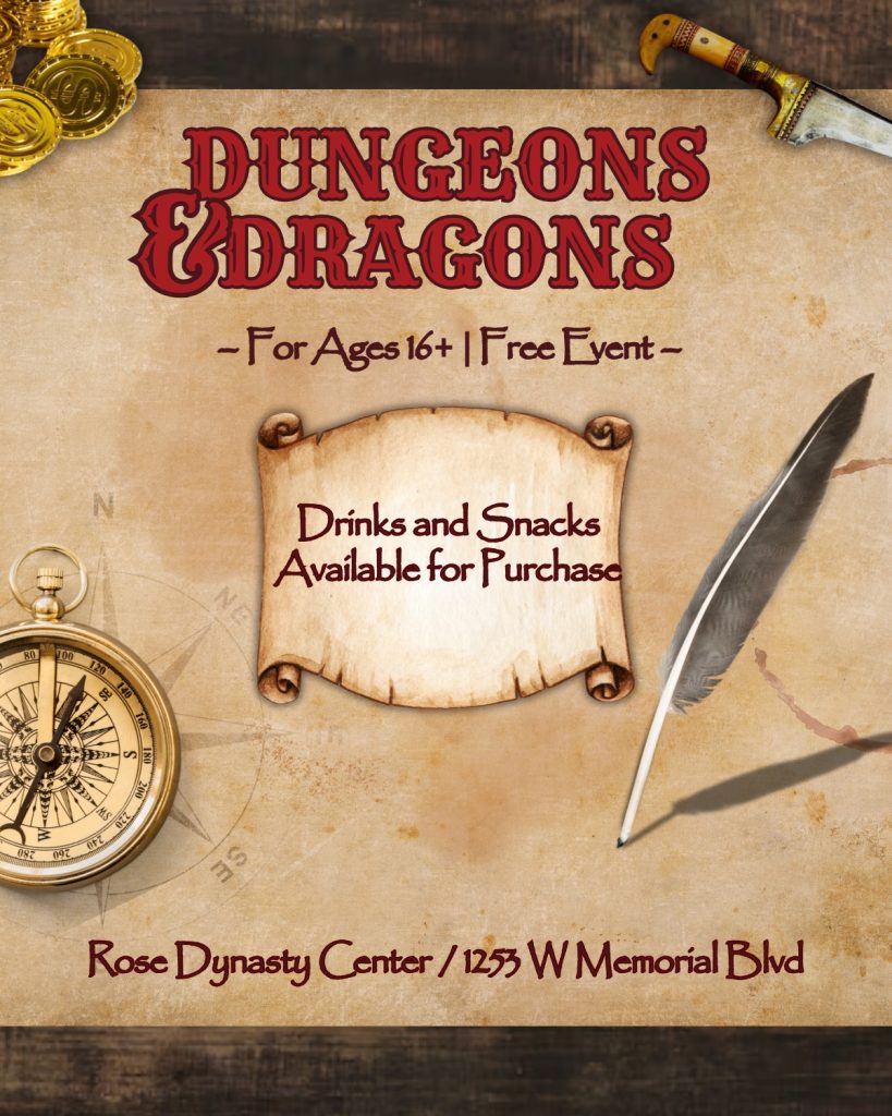 Ready to roll the dice and embark on an epic adventure? Join us for a Dungeons & Dragons event at the Rose Dynasty Center!
