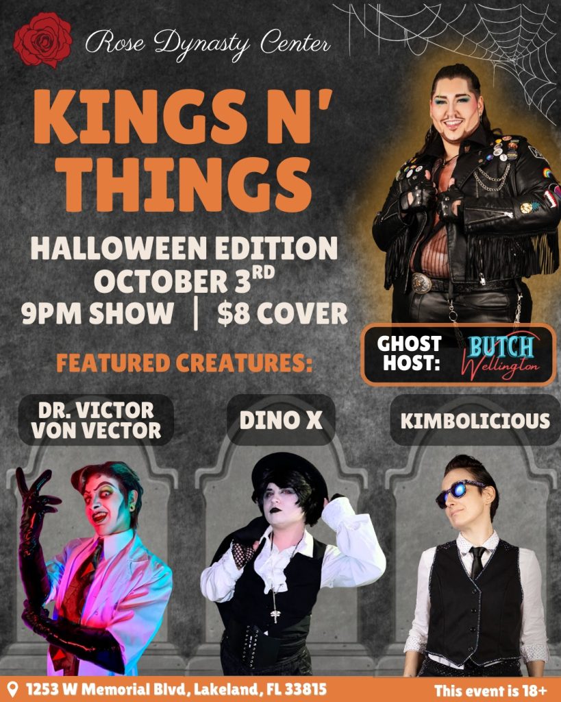 Join us at the Rose Dynasty Center for a Halloween Edition of Kings n’ Things, hosted by Butch Wellington and featured creatures Dr. Victor Von Vector, Dino X, and Kimbolicious. $8 cover at the door; this event is ages 18 and up.