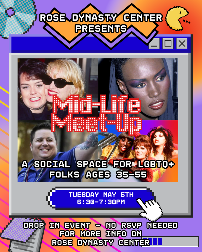 Join us at the Rose Dynasty Center for the Mid-Life Meet-Up, a social space for LGBTQ+ folks ages 35-55. Drop-in; no RSVP needed.