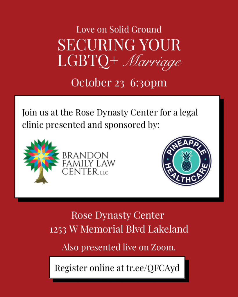 Join us at the Rose Dynasty Center for a legal clinic presented by Brandon Family Law Center, LLC and Pineapple Healthcare. This will also be presented on Zoom.