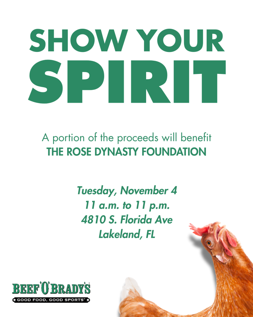 Help Beef ‘O’ Brady’s fundraise for Rose Dynasty Foundation. A portion of your purchases on November 4 from 11 a.m.- 11 p.m. will benefit Rose Dynasty.